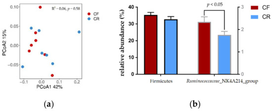 Bacterial community analysis based on the 16S rRNA gene sequencing. (a) The principal coordinate analysis (PCoA) of bacterial community based on Bray–Curtis dissimilarity matrix at the genus level. R2 = 0.06, p = 0.58. (b) The selected bacterial phyla and genera with significant differed between treatments, while other were present in Table S1. CF, silage diet with corn stover after fresh-corn harvested; CR, silage diet with corn stover after ripe-corn harvested.