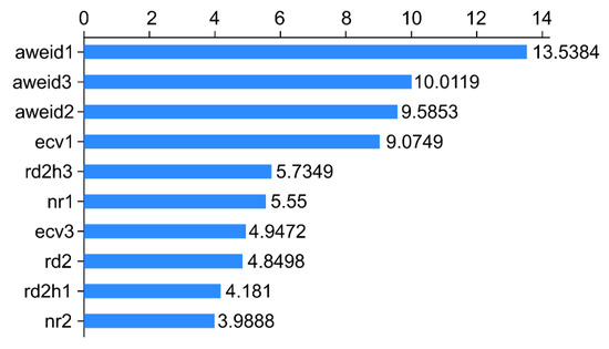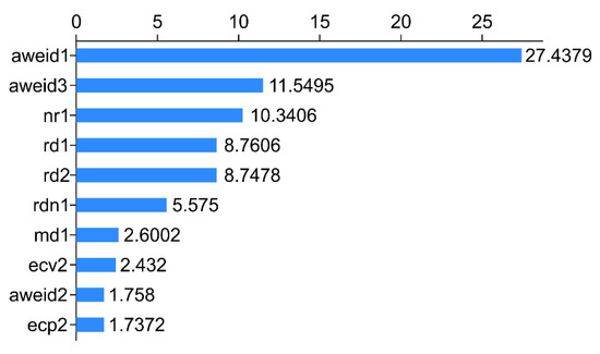 The ten variables, namely, aweid1, aweid3, nr1, rd1, rd2, rdn1, md1, ecv2, aweid2, and ecp2, represent the sum of the absolute values of weighted rumination variation on d-1, the sum of the absolute value of weighted rumination variation on d-3, rumination time at nighttime on d-1, the daily rumination time on d-1, the daily rumination time on d-2, the ratio of the rumination time at daytime to nighttime on d-1, the daily milk yield on d-1, the daily percentage of the variation of electrical conductivity of milk on d-2, the absolute value of weighted rumination variation on d-2, and the peak electrical conductivity of milk on d-2, respectively. The x-axis represents the score of the importance of the features evaluated by the measure “Gini” (Figure 2).