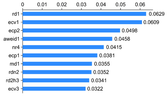 The ten variables, namely, rd1, ecv1, ecp2, aweid1, nr4, ecp1, md1, rdn2, rd2h3, and ecv3, represent the daily rumination time on d-1, the daily percentage of variation of the electrical conductivity of milk on d-1, peak electrical conductivity on d-2, the sum of the absolute value of weighted rumination variation on d-1, rumination time at nighttime on d-4, the peak electrical conductivity on d-1, the daily milk yield on d-1, the absolute value of rumination deviation every 2 h on d-3, and the daily percentage of variation of electrical conductivity of milk on d-3, respectively. The x-axis represents the score of the importance of features evaluated by the measure “Gini” (Figure 3).