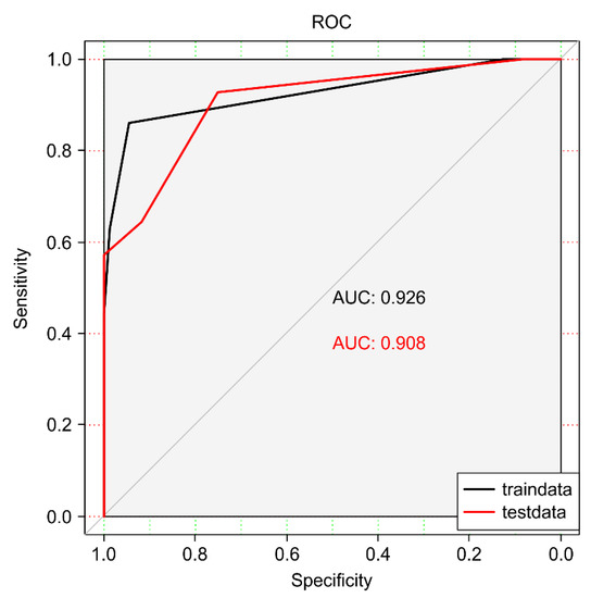 The black line depicts the ROC curve for train data, with the area under the ROC curve, whereas the red line depicts the curve for test data.