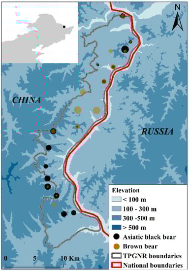 The TPGNR is located in Heilongjiang Province, northeastern China (48°02′48″~48°20′19″ N, 130°31′12″~130°50′11″ E), at elevations ranging from 72 m to 556 m above sea level (Figure 1). It occupies an area of 22,199 hm2 and is bordered to the east by Russia across the Heilongjiang River []. The area is in the middle temperate zone, with a temperate continental monsoon climate []. The TPGNR is mainly covered by natural secondary forest, which is regarded as representative of the temperate forest ecosystems along the China–Russian border []. The TPGNR provides important habitats for both Asiatic black bears and brown bears and plays a vital role in the cooperation of wildlife conservation across the China–Russian border [].