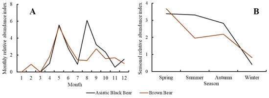 We explored the temporal overlap between Asiatic black bears and brown bears at three scales (monthly, seasonal, and daily). The number of independent captures was summarized by month and season, and the monthly relative abundance index (MRAI) and seasonal relative abundance index (SRAI) were calculated in accordance with the previous study [], whose variation can perform the monthly and seasonal activity pattern of the species []. According to the local climate, seasons were divided by the following criteria: spring (April–May), summer (June–August), autumn (September–October), and winter (November–March of the following year) []. The Wilcoxon signed–rank test was used to analyze the differences between the monthly and seasonal activity patterns of the Asiatic black bears and brown bears.