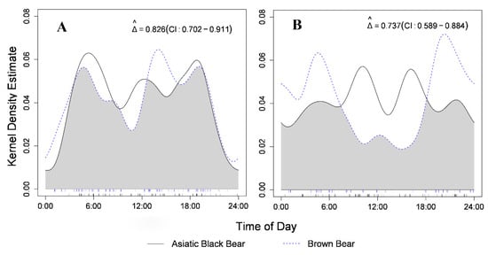 Daily activity patterns of Asiatic black bear and brown bear based on single–species detection (A) and co–detection (B) in Taipinggou National Nature Reserve, Heilongjiang Province, China, 2017. The mean value of the coefficient of overlap  is represented by the light grey area under the curves. Single–species detection was defined as independent detection of Asiatic black bear and brown bear at camera–trapping sites where only one species had occurred.