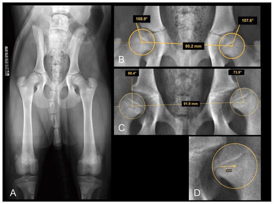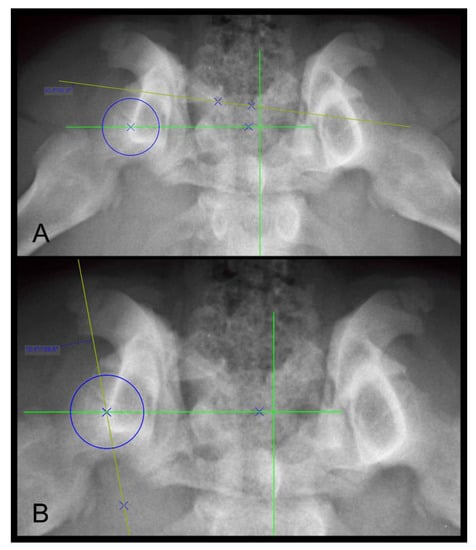 The CEA is an angle between the straight line, drawn from the center of the femoral head tangential to the outer edge of the acetabular rim, and the straight line, drawn parallel to the mid-sagittal axis of the pelvis/sacrum on DAR-view radiographs [,]. The CEA is used to assess the acetabular coverage of the head of the femur and is reported to be greater than 12° for healthy hips []. The magnification of the measurement of the CEA in a Rottweiler dog is shown in Figure 3B.