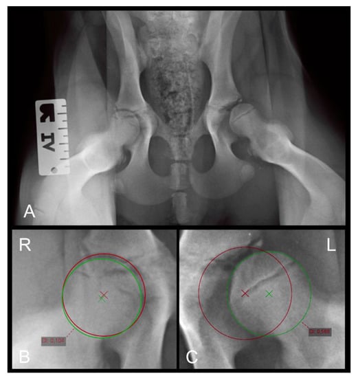 Canine hip dysplasia (CHD) is a progressive, complex, and polygenic disease, which develops during postnatal skeletal growth and is characterized by malformation of the coxofemoral joint leading to joint laxity, subsequent degenerative joint disease, and loss of articular function [,]. The main etiology of CHD is still under investigation, but genetics, dog breed, body weight and size, rapid growth, fat intake, and hormonal changes have been reported to be the most important factors [,,,,,]. Hip laxity is reported to be a primitive sign of CHD and an important predisposing factor of degenerative joint diseases [,]. A direct relationship has been reported between the severity of coxofemoral laxity and the incidence of degenerative joint disease [,]. Ossification disorders of the acetabulum and degeneration of the femoral head ligament and joint capsule have been considered as the main causes of hip laxity [,]. Hip laxity causes micro-fractures in the subchondral bone during the gait cycle, resulting in osteoarthritis [].