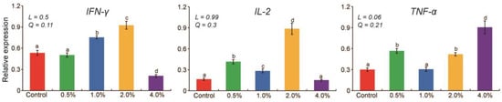 Quantitative evaluation indicated that dietary YC supplementation significantly affected (p < 0.05) immune gene expression levels (Figure 1). Compared with the control group, IFN-γ gene expression levels significantly increased at 1.0% and 2.0% (p < 0.05) and decreased at 4.0% (p < 0.05). IL-2 gene expression levels increased significantly at 0.5%, 1.0%, and 2.0% (p <0.05), and TNF-α gene expression levels were greater at 0.5%, 2.0%, and 4.0% (p < 0.05). IFN-γ and IL-2 gene expression levels were the highest at 2.0%, moderate at 0.5% and 1.0%, and the lowest at 4.0%. The TNF-α gene expression level tended to increase linearly (p = 0.06) with increasing levels of YC.