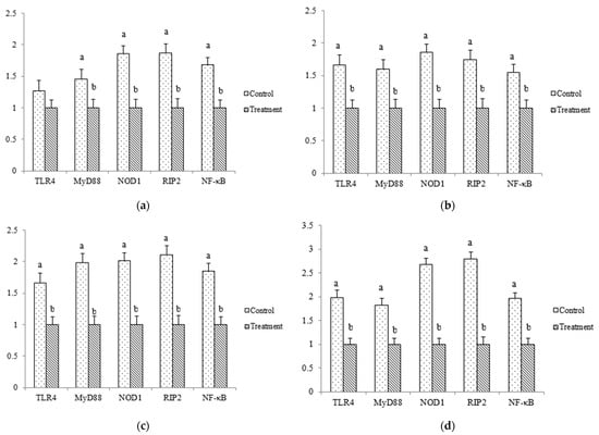 Gene expressions of TLR4, MyD88, NOD1, RIP2, and NF-κB in thymus of young laying pullets on days 14 (a), 21 (b), 28 (c) and 35 (d). Different letters indicate significant differences between mean values for a gene expression (p < 0.05). TLR4, toll-like receptors 4; MyD88, myeloid differentiation factor 88; NOD1, nucleotide-binding oligomerization domain protein; RIP2, receptor-interacting protein 2; NF-κB, nuclear factor-κB.