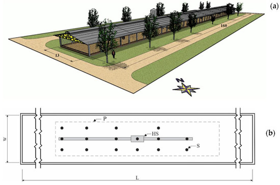 (a) Diagram of the broiler house evaluated in this study, indicating the main dimensions in meters. (b) Scheme of the position of sensors/recorders of air temperature, where W is the width of the area available for the broiler chicks and L is the length, HS is the heater system, and P is the plywood sheet.
