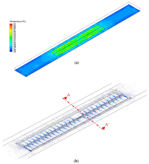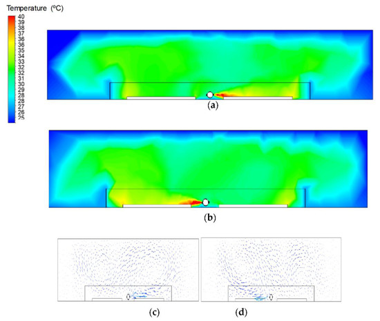Figure 4a,b show the air temperature distribution in the floor plan section view of the broiler house. The position of the section is indicated in Figure 3b by the red lines. It is possible to observe the hot air temperature distribution at the outlet of each side of the heating system inside the chick occupation area. The majority of the house is under the thermoneutral temperature for chicks, around 32 °C [15] indicated by the green area. However, the temperature of the hot air leaving the heating system tubing is greater than 39 °C. In addition, the figures also show some unfavorable conditions, with a mean air temperature greater than 36 °C represented by the yellowish areas near the plywood sheets, indicating unfavorable thermal comfort conditions in the first week of life of the chicks. According to [24], during the initial life period of the chicks, the control of the thermal variables inside the broiler facility must be better. When the chicks are submitted to uncomfortable thermal conditions, it may compromise the thermoregulatory system development and can cause respiratory diseases. According to [4], it is essential to emphasize that submitting young chicks to thermal challenge, even for a small period, may affect their growth, development, and welfare, so they may not be able to recover adequately. For this reason, it is very important to maintain an appropriate microclimate inside the poultry facility and to improve the animal welfare and production ultimately.