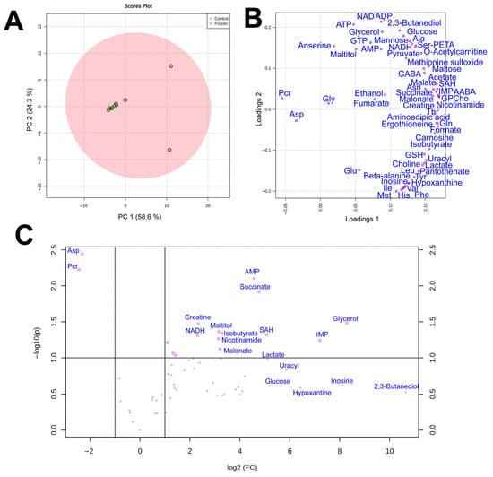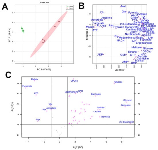 Score (A) and loading (B) plots of the principal component analysis (PCA) of metabolomic profiles of frozen (red) and control (green) hindlimb muscle samples of R. arvalis. The data are auto scaled. (C) Volcano plot for frozen and control muscle samples. Dots indicate individual substances.