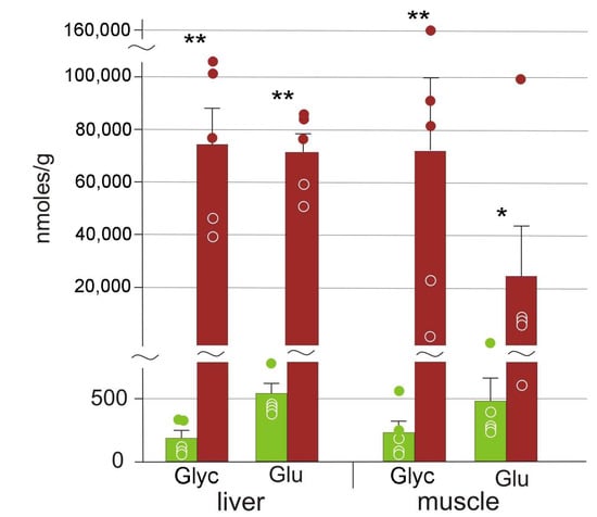 A total of 13 proteinogenic amino acids were detected in both tissues. In the liver, concentrations of seven of them changed significantly: for five, we observed an increase, and for glutamate and aspartate a decrease (Figure 7). In the muscle, average changes in the concentrations of the free amino acids were dramatic, but with very high variation, so only for two of them, alanine and aspartate, these changes were statistically significant. We should also note significant changes in amino acid derivatives, ergothioneine, carnosine, methionine sulfoxide, and S-adenosylhomocysteine in the liver, and of the latter in the muscle (Table 2).