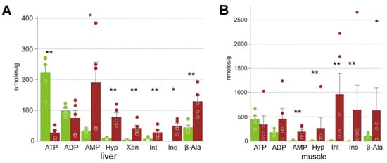 Products of nucleotide degradation in R. arvalis organs: Hyp, hypoxanthine; Int, inosinate; Ino, inosine; β-Ala, β-alanine. (A) Liver; (B) hindlimb muscle. Green columns, control; red, frozen; bar, SE; circles, individual data points; * Mann–Whitney test p < 0.05; ** p < 0.01.