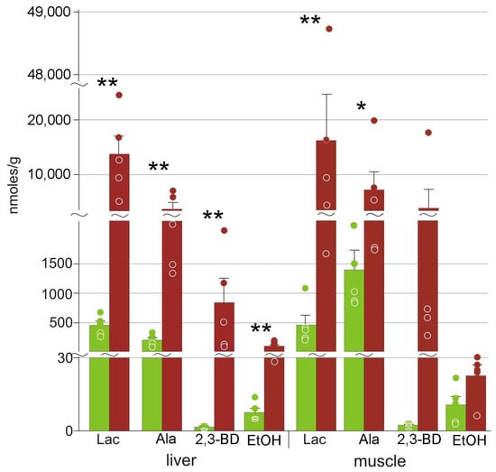 Concentrations of glycolysis end products in R. arvalis organs: Lac, lactate; Ala, alanine; 2,3-BD, 2,3-butanediol; EtOH, ethanol. Green columns, control; red, frozen; bar, SE; circles, individual data points; * Mann–Whitney test p < 0.05; ** p < 0.01.