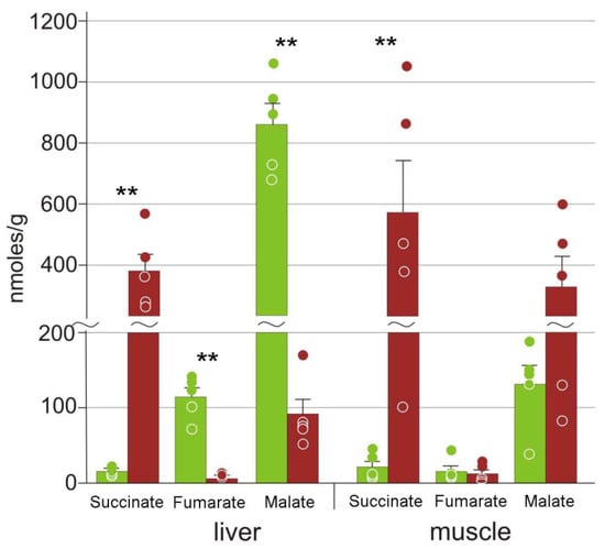 Three components of the Krebs cycle were found in the liver: succinate, fumarate, and malate; only the former two were detected in the muscles. The concentrations of succinate increased significantly in both tissues, while those of fumarate and malate were decreased in the liver (Figure 6).