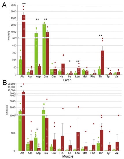 Concentrations of free amino acids in R. arvalis organs. (A) Liver; (B) muscle. Green columns, control; red, frozen; bar, SE; circles, individual data points; * Mann–Whitney test p < 0.05; ** p < 0.01.