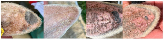 None of the pastured sheep displayed any clinical symptoms that could be attributed to possible ragwort poisoning. Their body condition score ranged between 3.5 and 4 at the end of the study period. Apart from some cases of minor to moderate signs of lesions (Figure 1), which all healed spontaneously, diseases such as photosensitization (that has been reported in white animals grazing on ragwort-infected pastures [43,44]), icterus, or weight loss (usually accompanied by plant poisoning [45]) were absent.