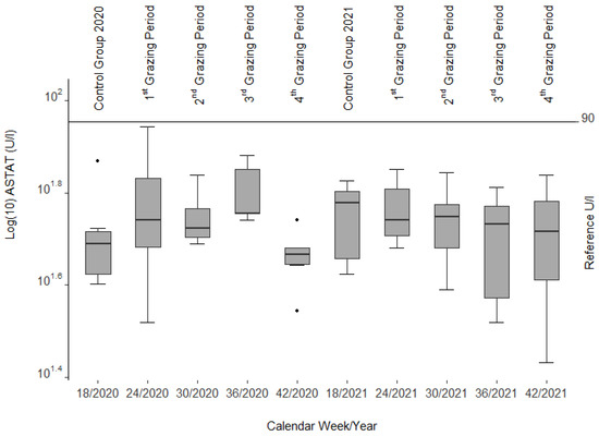 The ASAT activities were clearly within the reference range (30–90 U/L [39], cited in [40]). Except for the sudden decline in this enzyme during the 4th grazing period at the end of the first year (Figure 2), there were no significant changes.