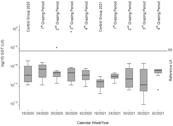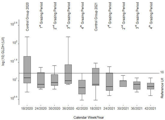 The median GLDH activities (Figure 3) remained with slight variations (1st and 2nd grazing period in 2020 and control group and 1st grazing period of 2021) and two clearly higher variations (control group and 3rd grazing period of 2020) within the reference range (1–16 U/L [39], cited in [40]) as well.