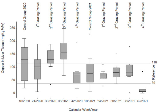 Second, the copper level in the liver increases due to the impairment of normal subcellular excretory mechanisms, including defects in lysosomal elimination of cell waste (Cheeke 1991, cited in [56]). Such a development could not be observed as the copper levels decreased significantly from the first control group in 2020 to the last group (4th grazing period) in 2020 and from the second control group in 2021 to the last group (4th grazing period) in 2021.