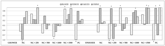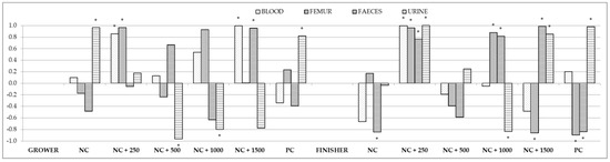 The correlation coefficients estimated for phosphorus content in the blood and in the femur, feces, and urine are presented in Figure 2 and Supplementary Table S2. No significant correlations were noted between the phosphorus content in the blood and its content in the femur. However, strong correlations were observed between its content in the blood and in the feces in group NC + 1500 (positive correlation) in the growing period and in group NC + 1000 (negative correlation) in the finishing period. Phosphorus concentrations in the blood and urine were also strongly correlated in groups NC (negative correlation) and NC + 1500 (positive correlation) in the growing period and in groups NC, NC + 1000, and PC (negative correlation) in the final period of fattening.
