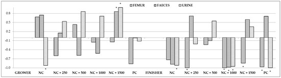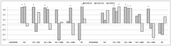 Correlation coefficients between phosphorus content in the chyme of the small intestine and in the blood, femur, feces, and urine were calculated, as well (Figure 1; Supplementary Table S1). Pearson’s correlation coefficient (r) between the level of phosphorus in the chyme and its content in the blood confirmed a significantly (p < 0.05) strong negative correlation in group PC during the whole fattening period, as well as for group NC + 1000 during the growing period and group NC + 250 in the finishing period. A high, but, in this case, positive correlation (p < 0.05) was noted for groups NC + 1500 (growing period) and NC + 500 (finishing). A high negative correlation was observed between the phosphorus content in the chyme and in the femur in group NC during the growing period. The correlation was equally strong in the finishing period, but positive (p < 0.05). A positive and strong correlation was also observed for these variables in the finishing period in groups NC + 250 and PC. Significant strong correlations between phosphorus content in the chyme and in the feces were observed only in the second fattening period for groups NC + 250 (negative) and for groups NC + 1000 and NC + 1500 (positive). Strong positive correlations were also noted between phosphorus content in the chyme of the intestine and in the urine in groups NC + 250 and NC + 1500 (first fattening period) and in groups NC + 1500 and PC (second fattening period).