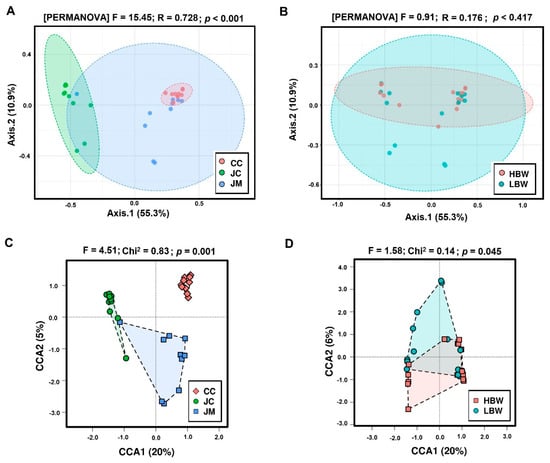 Principal coordinate analysis (PCoA) based on Bray–Curtis dissimilarity matrix on samples: (A) ordination of sampling places (JC, JM, and CC); (B) ordination of BW groups. Significance was examined with permutational multivariate analysis of variance (PERMANOVA) performed with 999 permutations. The differences were considered significant at a level of p < 0.05. (C) Canonical correspondence analysis (CCA) of gut microbiota clustering according to sample sites and (D) BW groups. Legend: JC—jejunum chymus in green; JM—jejunum mucosa in blue; CC—caecum chymus in red; LBW—low body weight; HBW—high body weight.