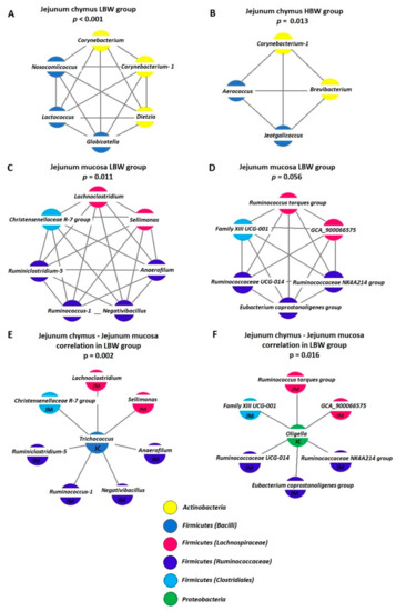 Regarding the connection between the JC and JM, a significant number of correlations were found only in the LBW treatment group. Trichococcus from the JC had positive correlations with seven genera from the JM (p = 0.002; Figure 2E). Oligella from the JC was also positively correlated with six genera from the JM (p = 0.016; Figure 2F). All the correlations between the JC and JM were positive.