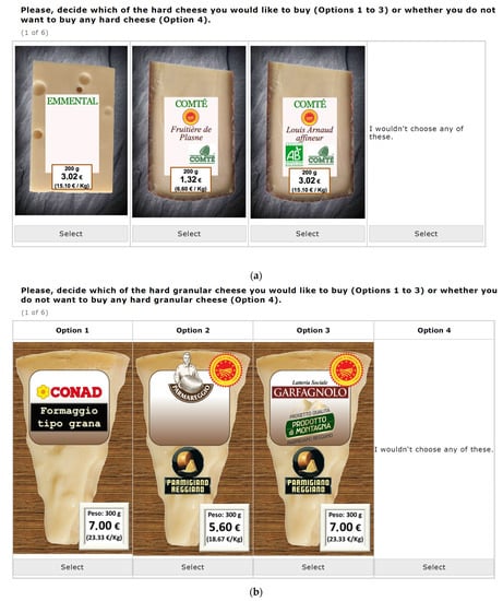 A cheap talk was used to briefly introduce the participants to the choice experiment, explaining the rationale behind the experiment and the need to respond carefully to the questions. Cheap talk strategies have been proved to eliminate or reduce hypothetical bias [47]. During the DCE, the participants simulated a purchase decision, choosing one of the three presented cheese products, plus an opt-out option. The opt-out or no-choice option gives consumers the alternative of not purchasing the cheese products, which better models real consumers’ purchase contexts. A reduced D-optimal design based on three product alternatives was employed using Ngene software (Version 1.2, ChoiceMetrics, Sydney, NSW, Australia) [48]. Overall, 20 blocking versions of the choice set were generated; participants were requested to answer six randomly assigned choice sets in the survey (Figure 1a,b).