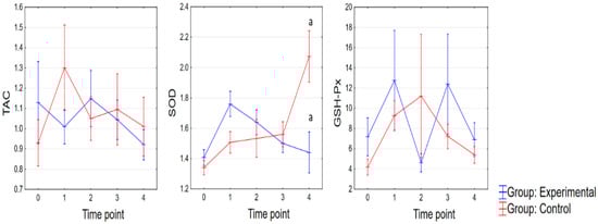 The application of ANOVA for repeated measures showed there was no statistically significant difference between the control and experimental groups in measured total antioxidant capacity (F(9, 140) = 0.616, p = 0.78) or in glutathione peroxidase level (F(9, 140) = 1.01, p = 0.43) during the entire study (Figure 1). On the other hand, a statistically significant difference was noticed in the levels of superoxide dismutase between the two groups (F(9, 140) = 4.61, p = 0.001), where post hoc Tukey’s HSD test showed that a difference in superoxide dismutase existed at the end of the applied treatment (Time point 4, Figure 1).