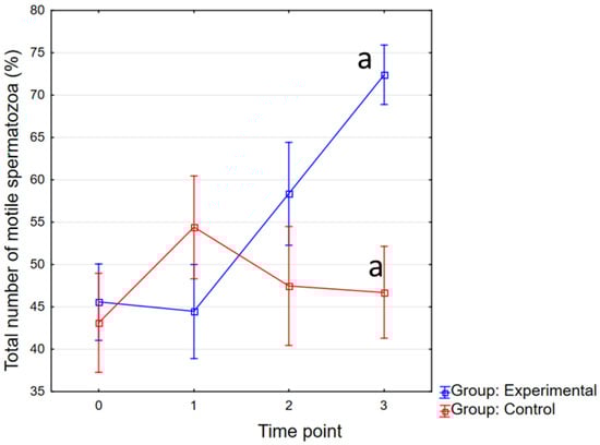 Comparison of total number (%) of motile spermatozoa from the control and experimental groups of boars at different time points in the study. Vertical bars denote standard error while small letters (a) denote statistically significant differences at specific time points.
