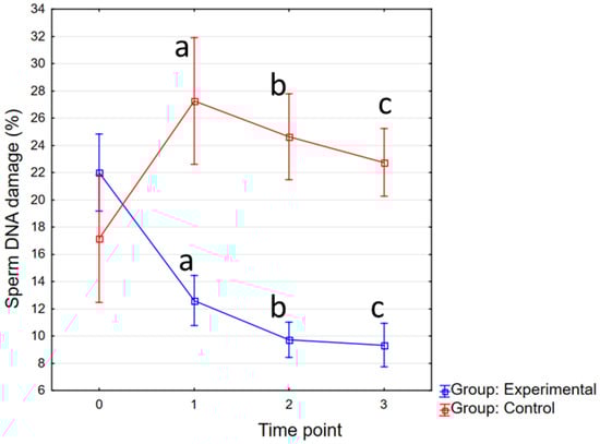 Comparison of spermatozoa DNA damage (%) in semen from the control and experimental groups of boars at different time points in the study. Vertical bars denote standard error while small letters (“a”, “b” and “c”) denote statistically significant differences at specific time points.