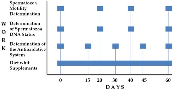 Semen samples (Scheme 1) were collected on the commercial pig farm in the autumn of 2020. Those native sperm samples were taken on the first day of the study (1st September), and then every fifteen days for two months (a total of five samplings), while fresh diluted boar semen was controlled four times within an eight-week interval (the date the study started, and afterwards on every twentieth day). Semen was collected by manual fixation of the penis in a plastic bottle for boar semen (Minitube, Tiefenbach, Germany). Upon ejaculation, each semen sample was diluted 1:2 in a commercial extender (Vitasem, Magapor S.L., Zaragoza, Spain), and transported to the laboratory. The dynamics of collecting samples for testing was harmonized with the program of regular collection of semen from boars for the needs of the AI reproduction center, so that boars would not be used additionally.