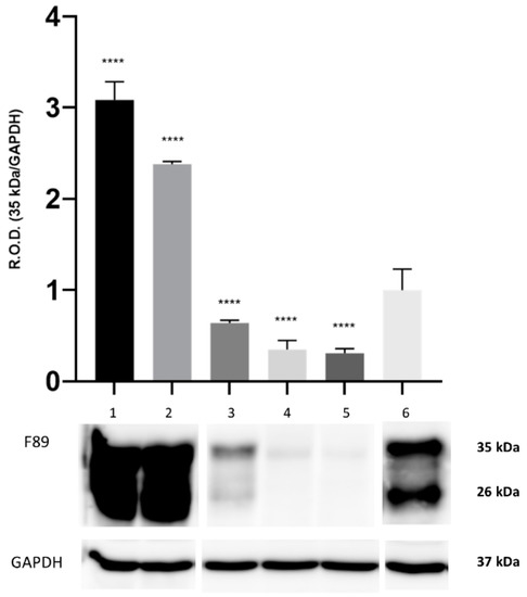 Representative Western blot (WB) analysis of the 35 kDa and 26 kDa bands obtained with the anti-prion protein (PrP) MAbF89/160.1.5. Brain tissue from three striped dolphin specimens found stranded along the Italian coast of Apulia (lanes 1 and 3) and in Canary Islands (lane 2), all of which affected by neurobrucellosis due to Brucella ceti. The results of WB analyses carried out on the brain tissue of one lamb (lane 4), one goat (lane 5), and one control (B. ceti-negative) striped dolphin found stranded along the Tyrrhenian coast of Tuscany (lane 6) are also shown (original Western blot figure is in Figure S1). GAPDH was used as a protein load control. The graph depicts only the optical density of the 35 kDa band. The results are expressed as mean ± SEM (n = 4). The statistical significance was analyzed by the ANOVA Dunnett method, **** p < 0.0001 vs. the striped dolphin negative control specimens.