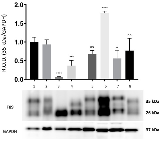 Representative WB analysis of the 35 kDa and 26 kDa bands obtained with the anti-PrP MAbF89/160.1.5. Brain tissue samples from 8 striped dolphins found stranded along the Italian coastline (lanes 1–8), four of which affected by neurobrucellosis due to Brucella ceti (lanes 5–8). The results of WB analyses carried out on the brain tissue of four control (B. ceti-negative) striped dolphins found stranded along the Italian coastline (lanes 1–4) are also shown (original Western blot figure is in Figure S2). GAPDH was used as a protein load control. The graph depicts only the optical density of the 35 kDa band. The results are expressed as mean ± SEM (n = 4). The statistical significance was analyzed by ANOVA Dunnett method, **** p ≤ 0.0001, *** p ≤ 0.001, ** p ≤ 0.01, ns p ≥ 0.05 vs. the striped dolphin negative control specimens.