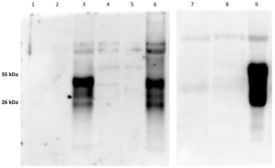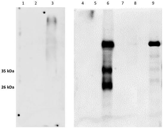 Results of WB analyses carried out with the anti-PrP MAb F89/160.1.5 on the pellets obtained after ultracentrifugation of brain tissue samples from one negative control (B. ceti-uninfected) striped dolphin found stranded along the Tyrrhenian coast of Tuscany (lanes 1–3), as well as from two B. ceti-infected, neurobrucellosis-affected striped dolphin specimens found stranded along the Italian coast of Apulia (lanes 4–6) and in Canary Islands (lanes 7–9), respectively. The typical 35 kDa and 26 kDa PrPc bands are shown at lanes 3, 6 and 9 after ultracentrifugation, while lanes 2, 5 and 8 show the WB results obtained after PK digestion, and lanes 1, 4 and 7 after treatment with deglycosydase F (original Western blot figures are in Figure S4a,b).