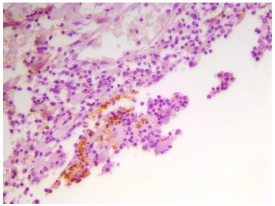 B. ceti-infected, neurobrucellosis-affected striped dolphin (S. coeruleoalba) specimen. Cervical spinal cord. Evidence of Brucella spp. antigen in the cytoplasm of macrophages/histiocytes forming the inflammatory infiltrate is shown in this picture. Immunohistochemistry (IHC) against Brucella spp. with an anti-B. melitensis MAb (produced at IZSAM “G. Caporale”, Teramo, Italy), Mayer’s hematoxylin counterstain.