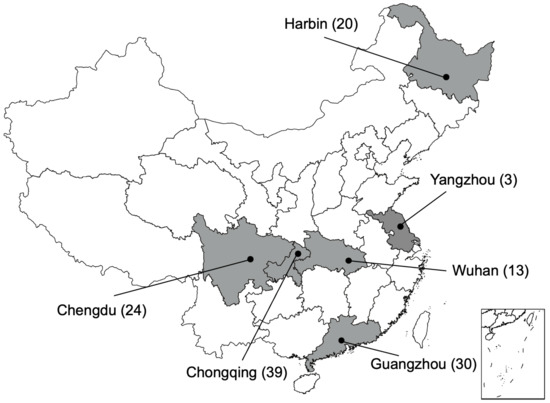 Map of sampling sites. The black dots represent the cities that the veterinary clinics were located in. The number of samples are marked after the name of cities.