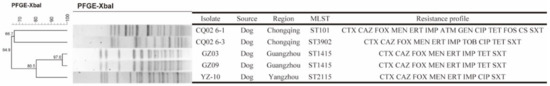 From July to November 2015, a total of 129 rectal swabs of healthy or diseased dogs and cats were collected from veterinary clinics in six different cities including Harbin, Yangzhou, Chongqing, Wuhan, Chengdu and Guangzhou, in China (Figure 1). The information about the dogs and cats, including their age, gender, species, health status, reasons to go to the veterinarian was investigated (Table S3). All of the swabs were directly streaked onto MacConkey agar plates containing 1 mg/L meropenem and were incubated overnight at 37 °C; then, the agars with isolates were transferred to our lab within 24 h at low temperature. Colonies of different morphologies were picked and re-streaked for further identification. Bacterial species were identified by MALDI-TOF-MS (Matrix-Assisted Laser Desorption/Ionization Time of Flight Mass Spectrometry, Shimadzu-Biotech Corp., Kyoto, Japan).