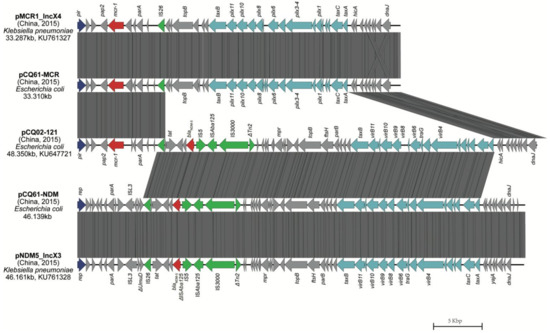 Linear sequence comparisons of pCQ61-NDM and pCQ61-MCR with other plasmids, including pMCR1_IncX4 (GenBank Acc. no. KU761327), pNDM5_IncX3 (GenBank Acc. no. KU761328) and from our previous study pCQ02-121 (GenBank Acc. no. KU647721). Boxed arrows represent the position and transcriptional direction of ORFs (open reading frames). Regions of >99% identity are marked by grey shading. Dark blue represents replication-associated genes, and light blue represents genes associated with the pil, tra and vir loci. ARGs are colored red; insertion sequences are colored green.