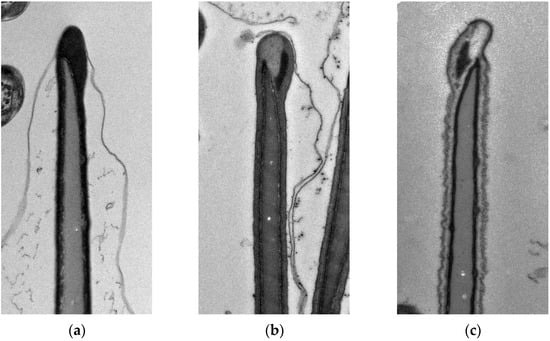 For assessment of changes caused by freezing, transmission electron microscopy was used as described previously by Olexikova et al. [23]. Briefly, fresh and F/T sperm samples were fixed in a fixative solution (2% paraformaldehyde and 2.5% glutaraldehyde in 0.15 mol·L−1 sodium cacodylate buffer, pH 7.1–7.3) during 1 h at 4 °C. Subsequently, the sperm was washed three times in cacodylate buffer for 15 min. Sperm pellets were post-fixed in 1% osmium tetroxide in cacodylate buffer during 1 h and embedded into 2% agar. Samples were then dehydrated by passing them through an acetone series and embedded into PolyBed resin (Polysciences Inc., Warrington, PA, USA). Ultrathin sections (70 nm) were placed on nickel grids, contrasted with uranyl acetate and lead citrate, and examined on a transmission electron microscope (JEM-2100, JEOL, Tokyo, Japan) operating at 80 kV. For each group, electronograms were made at the magnification of ×10,000. Randomly selected view fields were evaluated on multiple meshes with ultrathin section. From each group, at least 400 individual sperms were evaluated, cut through the front part of the head with visible acrosome. The sperms with a visible morphological abnormality were excluded from the evaluation. According to the state of the plasma membrane, the sperms were classified into three classes of quality. The first quality class included sperms with intact plasma membrane in the acrosome area and in the post-acrosomal region or with a slightly waved membranes present only in the post-acrosomal region. The acrosome mass was markedly dense (Figure 2a). Sperms with a slightly disturbed plasma membrane in the acrosome area as well as in the postacrosomal region were included in the second quality class (Figure 2b). The acrosome showed signs of enlargement and swelling. The third quality class included sperms with a significantly disturbed and damaged plasma membrane. Sperms exhibited loss of acrosomal content (Figure 2c).