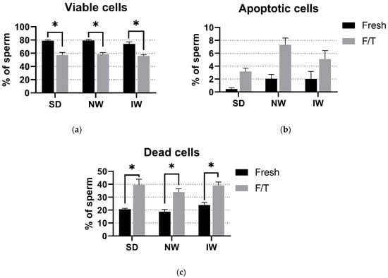 Comparative analysis of viable (a), apoptotic (b), and dead (c) spermatozoa among the breeds. SD—Slovak Dairy, NW—Native Wallachian, and IW—Improved Wallachian. No significant differences (p > 0.05) among breeds were found. * Significant difference (p < 0.05) between the fresh and F/T groups in the number of viable and dead sperm. The data are represented as means ± SEM.