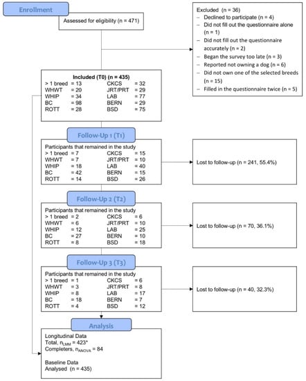 At T0 435 dog owner participated, of which 84 completed the study. Thus, the dropout rate was 80.7%. For a more detailed description see Figure 1. The number of participants per breed at T0 varied from 20 (WHWT) to 98 (BC).