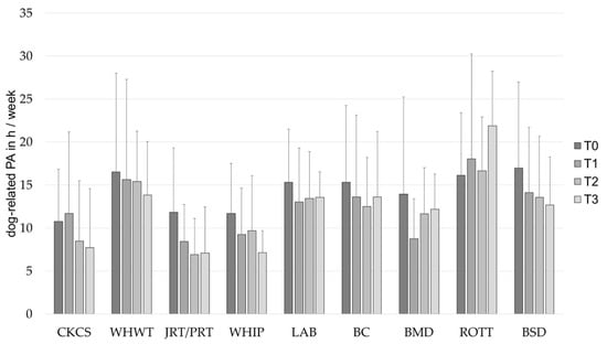 Dog-related PA in h/week (mean ± SD) of owners of different dog breeds at baseline (T0), after 1 (T1), 2 (T2) and 3 (T3) years. BC, Border Collie; BERN, Bernese Mountain Dog; BSD, Belgian Shepherd Dog; CKCS, Cavalier King Charles Spaniel; JRT/PRT, Jack and Parson Russell Terrier; LAB, Labrador Retriever; PA, physical activity; ROTT, Rottweiler; WHIP, Whippet; WHWT, West Highland White Terrier.