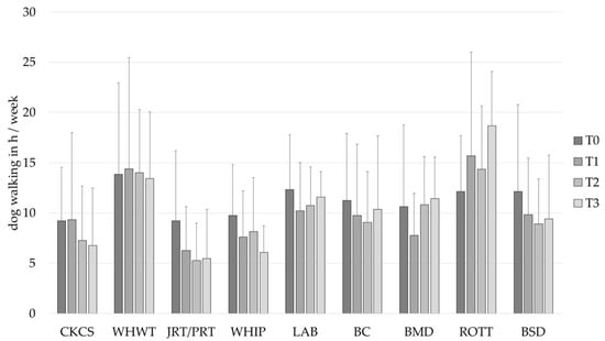 Dog walking in h/week (mean ± SD) of owners of different dog breeds at baseline (T0), after 1 (T1), 2 (T2) and 3 (T3) years. BC, Border Collie; BERN, Bernese Mountain Dog; BSD, Belgian Shepherd Dog; CKCS, Cavalier King Charles Spaniel; JRT/PRT, Jack and Parson Russell Terrier; LAB, Labrador Retriever; ROTT, Rottweiler; WHIP, Whippet; WHWT, West Highland White Terrier.