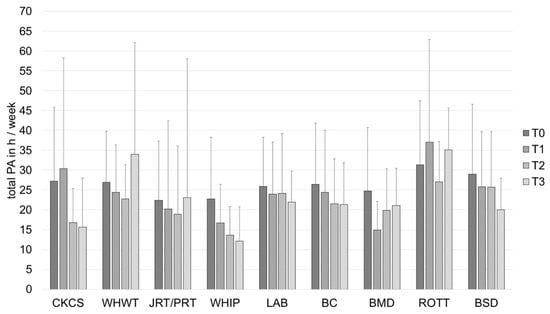 Total PA in h/week (mean ± SD) of owners of different dog breeds at baseline (T0), after 1 (T1), 2 (T2) and 3 (T3) years. BC, Border Collie; BERN, Bernese Mountain Dog; BSD, Belgian Shepherd Dog; CKCS, Cavalier King Charles Spaniel; JRT/PRT, Jack and Parson Russell Terrier; LAB, Labrador Retriever; PA, physical activity; ROTT, Rottweiler; WHIP, Whippet; WHWT, West Highland White Terrier.
