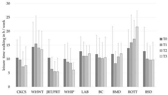 Leisure time walking in h/week (mean ± SD) of owners of different dog breeds at baseline (T0), after 1 (T1), 2 (T2) and 3 (T3) years. BC, Border Collie; BERN, Bernese Mountain Dog; BSD, Belgian Shepherd Dog; CKCS, Cavalier King Charles Spaniel; JRT/PRT, Jack and Parson Russell Terrier; LAB, Labrador Retriever; ROTT, Rottweiler; WHIP, Whippet; WHWT, West Highland White Terrier.
