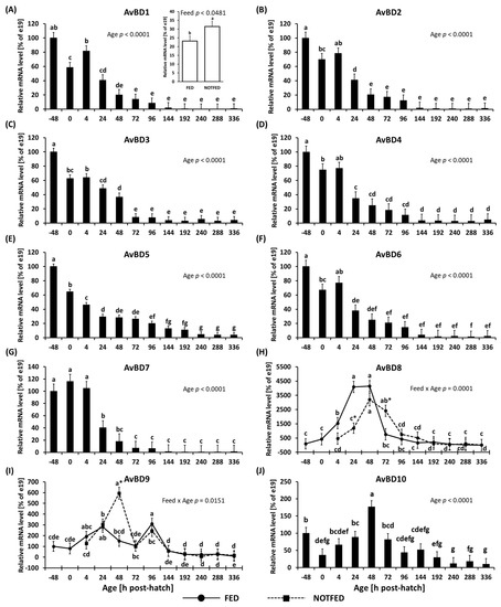 By 72 h their expression reached steady levels. The decrease in expression of these genes was large and by 336 h it decreased by more than 99% compared to values observed at −48 h. The expression of AvBD1 was significantly (p = 0.0481) higher in NONFED birds (Figure 3A inset). Expression of AvBD8 and 9 (Figure 3H,I) showed a significant interaction between age and feed status (p = 0.0001 and p = 0.0151, respectively). The expression of AvBD8 was lower at 24 h, but greater at 72 h PH in NONFED compared to FED birds. The FED birds showed an increase in expression beginning at 4 h, reaching its peak at 48 h, followed by decrease in expression. NONFED birds followed a similar expression pattern as FED birds. By 192 h, the expression of AvBD8 in both FED and NONFED birds remained steady (Figure 3H). The expression of AvBD9 was significantly higher at 48 h in NONFED birds (Figure 3I). This peak in expression was followed by a large drop at 72 h, after which both FED and NONFED birds followed a similar expression pattern, with steady expression continuing from 144 h until the end of the study at 336 h. The expression of AvBD10 is shown in Figure 3J. The expressions of AvBD10 showed a significant effect of age (p < 0.0001), where expression decreased from −48 h to 0 h followed by an increase in expression, which peaked at 48 h followed by a gradual decrease (Figure 3J).