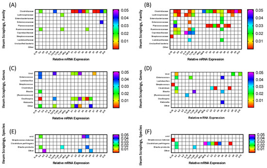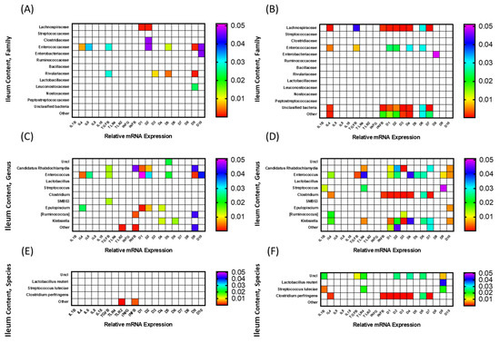To determine whether relationships exist between mRNA expression of immune-related genes and components of the microbiota, a correlation analysis was carried out and significant (p < 0.05) interactions are displayed as heat maps in Figure 5 and Figure 6. The microbiota composition was determined for both ileal contents and scrapings of FED and NONFED birds. The correlation analysis of ileal content (luminal bacterial population) is shown in Figure 5, and that of ileal scrapings (mucosal bacterial population) in Figure 6. The analyses were carried out at the family, genus, and species levels.
