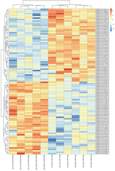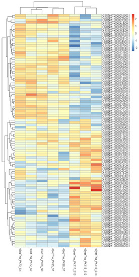 Heatmap of 100 most significant differentially expressed genes affected by increased temperature without a taxifolin treatment.
