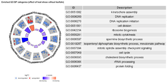In both groups, increased temperature causes upregulation of protein folding-related genes and downregulation of genes involved in DNA replication and cell division; however, there are more significantly enriched terms and genes in taxifolin-treated fishes. Our results implying downregulation of cell growth and the activation of heat shock proteins in trout liver due to heat stress are similar to those described in a previous study [39]. However, we do not observe a significant increase in inflammation- and cell death-related categories. Inflammatory processes were documented among the major differentiated GO terms in trout under heat stress [39]. Lewis et al. [42] have also noted the increased expression of kappa-B inhibitor after the stress, presumably to recover the pool of this protein depleted by NF-κB activation. A relatively weak upregulation of kappa-B inhibitor alpha is present in HSyesTyes/HSnoTyes contrast (LFC 1.05, FDR 0.0009), but GO enrichment does not support a significant inflammation-related response. Further, no differential expression of interleukins, TNF- α or most Nod-like receptor genes was observed. The only DE NOD-like receptor gene (GSONMT00026925001) is downregulated in HSyesTno/HSnoTno contrast (LFC −2.01, FDR 0.03).